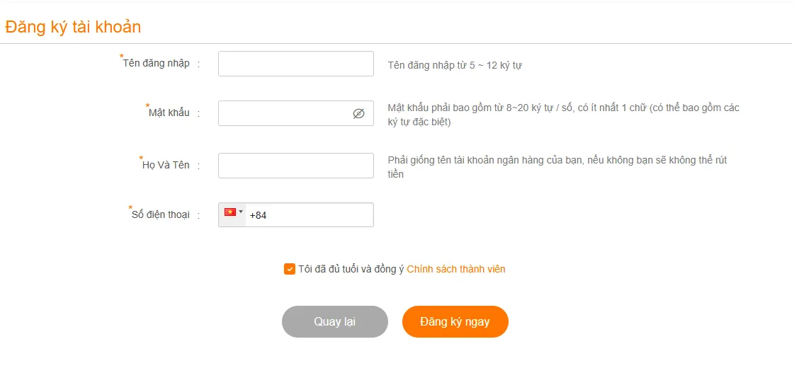 Bước 4: Xác nhận đủ 18 tuổi và đồng ý với điều khoản của Sv388 → Nhấn “Đăng ký” để hoàn tất.